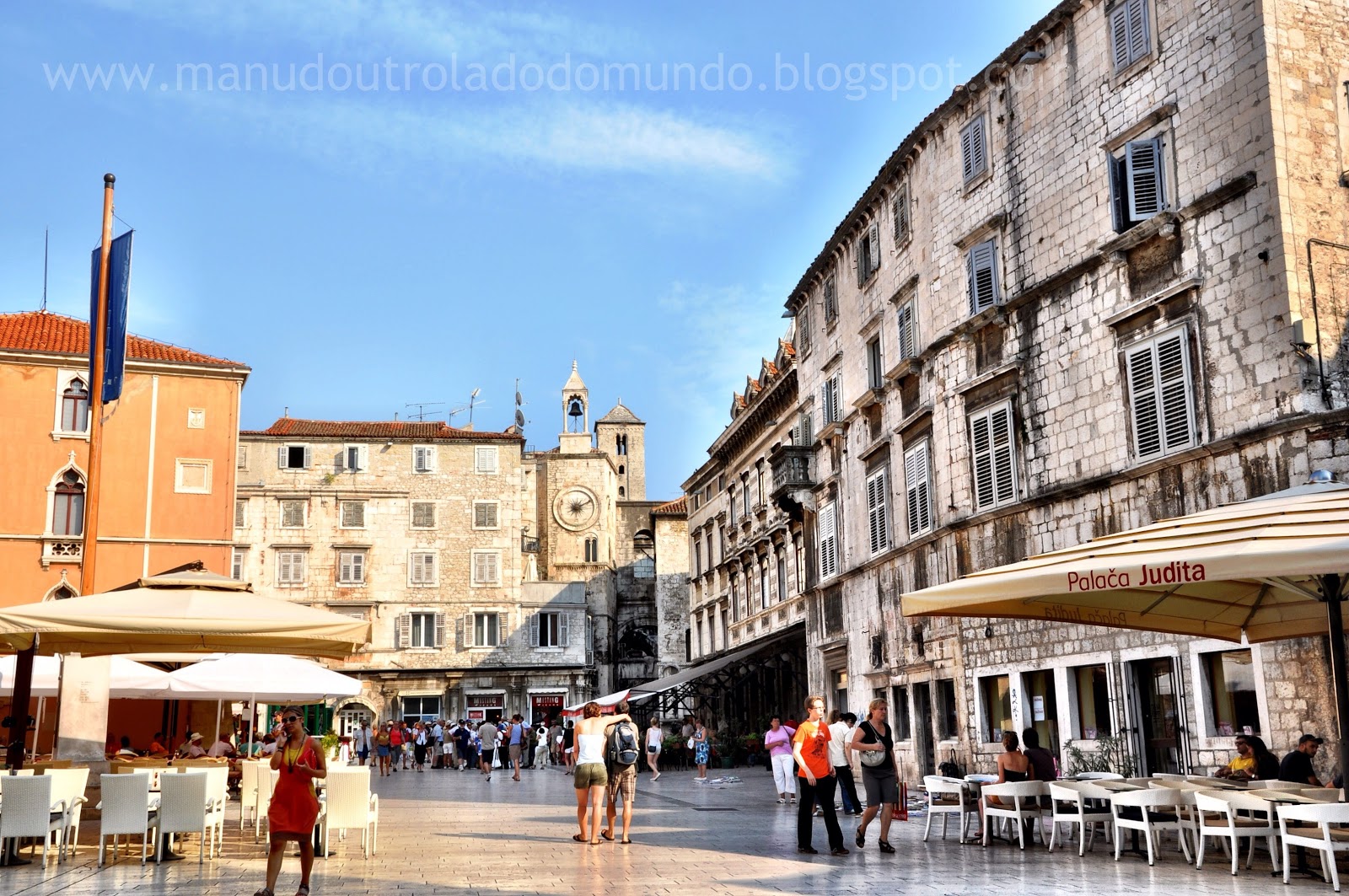 A alguns minutos dali, uma praça muito famosa de Split, a Pjaca (praça) Narodni Trg é um ponto de encontro de lojas, bares e restaurantes. Após uma caminhada de 5 minutos, abre-se um clarão e a praça do século 15 salta aos olhos com tanta delicadeza e beleza tendo ao fundo a torre do relógio que revela o que foi há muito tempo atrás o principal centro da cidade.